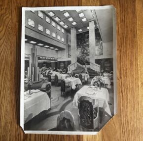 Huge publicity photo of the first-class dining room on board the French Line Ile de France, one of the most beautiful Art Deco liners ever built. 15.75″ x 11.75″. Some issues with two corners and bottom right corner missing but does not affect image. JF