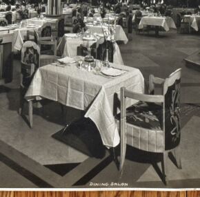 Huge publicity photo by Byron of the first-class dining room on board the French Line Ile de France. Measures about 13.25″ x 10.25″. Had been folded on the bottom right at some point, but this does not affect the image. JF