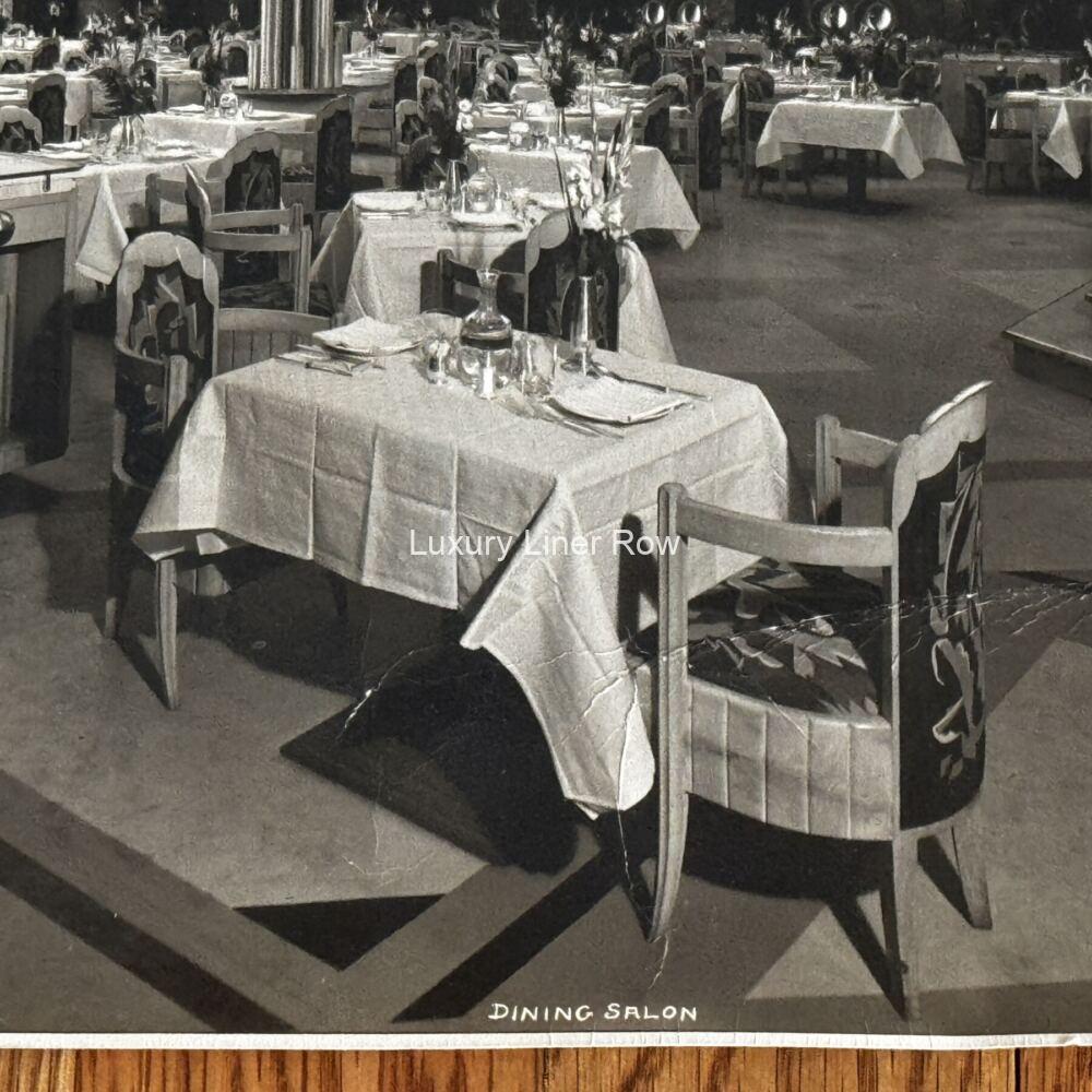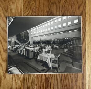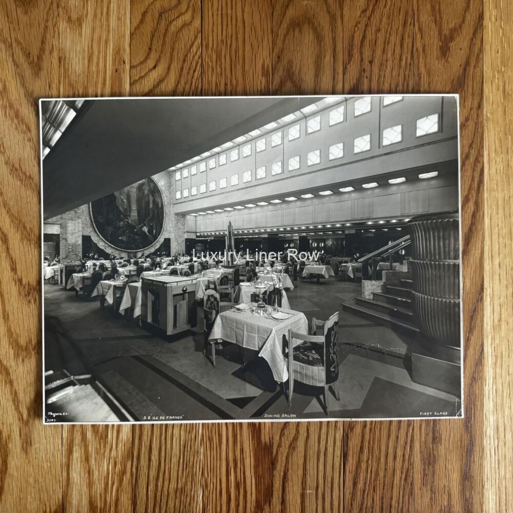 Huge publicity photo by Byron of the first-class dining room on board the French Line Ile de France. Measures about 13.25″ x 10.25″. Had been folded on the bottom right at some point, but this does not affect the image. JF