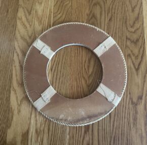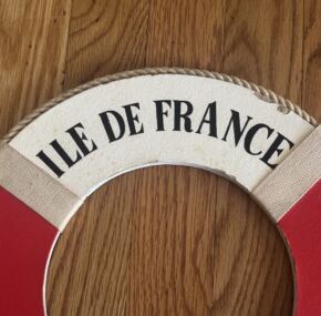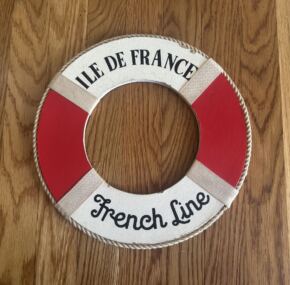 Souvenir life ring for the French Line’s famous Ile de France. Made of heavy duty cardboard. In very good condition for a not-often-seen item of French Line souvenirs. It measures about 12″ across.