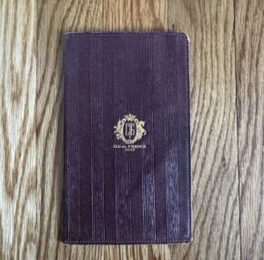 On-board souvenir from one of the most spectacular of all French liners. Souvenir leather wallet from the Ile de France. Measures about 7″ x 4″. JF