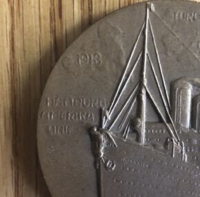 Ultra-rare, solid-bronze medallion for the ss Imperator of Hamburg America Line. Dates to her maiden voyage. Imposing portrait of the Kaiser on the reverse and a fine image of the ship on the front. Marked 1913 and shows the ship with her fantastic but short-lived eagle on her bow. These are vastly harder to come by than French Line medals, for example.