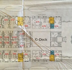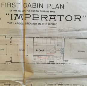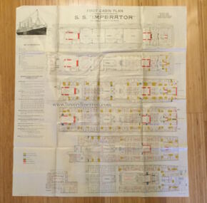 Outstanding pre-maiden voyage first-class deck plan for the s.s. Imperator. Printed on onion paper, the plan is dated 4-1913 and was printed in the United States. Measures 36″ x 33″ when open. Considering it is over 100 years old and was not really meant to last, this plan is in remarkable condition with just a few slight edge issues. Frame it and enjoy the highlight of any HAPAG and Imperator collection.