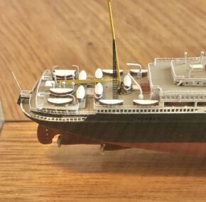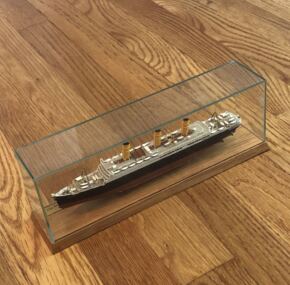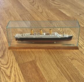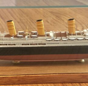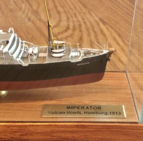 Absolutely stunning model of the HAPAG liner ss Imperator. Although I usually don’t deal with modern items, this model is so lovely, I couldn’t resist. Extremely detailed right down to the famous eagle on her bow. “Mein Feld ist die Welt.” Made by the Classic Ship Collection in Travemüde, Germany. The model measures about 9″ long, and the case is 10.5″ x 2.5″ x 3.5″ tall. She later became the RMS Berengaria of the Cunard Line. Perfect condition.