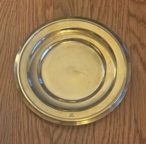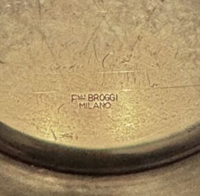 Mint condition and exceedingly rare gold-washed salver made by Broggi. I know Italia used some gold washed items in first-class. Anyone out there know what it was used for? I know silver ruins the taste of caviar so perhaps this is a part of that exalted service. Never had another. It measures about 6.5″ across. Not often seen and a treat to put in your case. Made by Broggi with the slightest of utensil marks. “Treat yourself!” JF