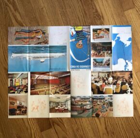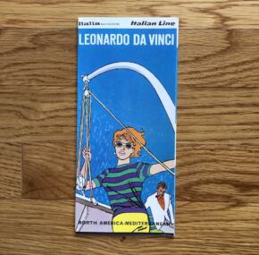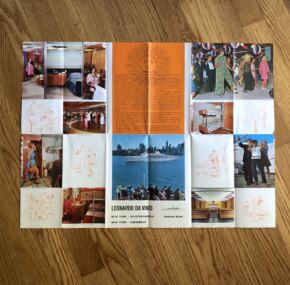 Late 1960’s fold-open flyer for the Andrea Doria’s fantastic replacement, the Leonardo da Vinci. I know some people who sailed on her, and they all say that she was pretty amazing. I haven’t had this flyer in many years. In near mint condition and shows the ship in full color. She would have been fun because a crossing on the southern route was much more like a cruise. When open, the brochure measures about 23″ x 17″.