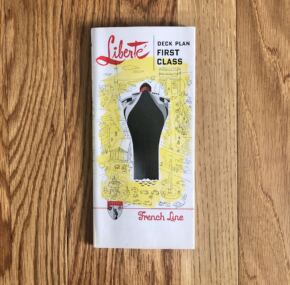 First-class deck plan for the ss Liberte.  She was certainly CGT’s finest ship in the immediate post-war era.  It’s a fascinating look at the layout of what used to be the North German Lloyd flyer Eurpoa.  The travel reviews I’ve seen for this Normandie replacement, if you will, were glowing.  17 photos.  When opened, it measures 34″ in length.  Excellent condition.