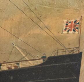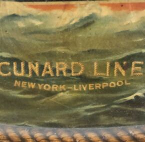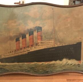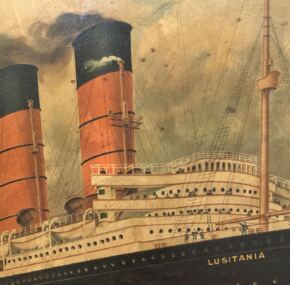 Impressive advertising tin produced by the Cunard Line for the ill-fated RMS Lusitania circa 1907. Very detailed. For an advertising piece, it’s incredibly detailed down to the crow’s nest bell and the whistles. In remarkable condition and one of the best I have ever seen. These are often extremely rusty, dented, and/or with large scratches to the lithographed image. This one just has some age spots, browning to the varnish due to age, and some small bends at the edges. These were produced to hang in travel agencies and feature an interesting rope nautical-motif border. Measures about 38″ x 28″. A crowning piece to any Lusitania collection. If condition is everything for your collection, this is the one for you! Even your non-liner friends will be impressed.