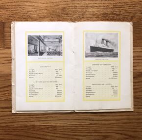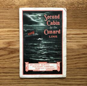 This brochure is how the Thorp family chose their accommodation on the RMS Lusitania. Running 20 pages, the brochure is a time capsule of Cunard in 1914-1915. Mentioned are the famous Cunarders Lusitania, Mauretania, Aquitania Carpathia, etc. Loads of photos and even sample menus. Chipping to the sides of the covers but contents fine.