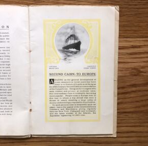 What’s amazing about this brochure (and several other items in the Lusitania section of Luxury Liner Row) is that they all come from the Thorp family who took the last completed eastbound crossing RMS Lusitania undertook in April of 1915, and they have quite a story behind them. The husband and wife were very adventurous and decided they wanted to see the war first hand. So they crossed on Lusitania. Despite having to get a passport, register with the British police, register with the French Police, and go to the British and French consuls’ offices to get permission to go out to the front, in the end, they made it all the way up to the fighting. The family was booked to return on the Lusitania on May 15, obviously a voyage they couldn’t take. They changed their tickets to the May 8 crossing of the ss New York of the American Line.