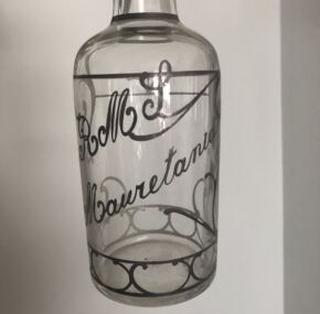 The quality of everyday items from 1907 is really refreshing in our outsourced world of plastic and cheaply manufactured junk. Have you heard of designed obsolescence and the other ridiculous ideas brought to us in the name of progress? I think that is why I really enjoy studying, learning, and even owning bits of history. This souvenir bottle fits the bill of owning an interseting bit of history. It is decorated with sterling silver design and the name of FDR’s favorite liner–the Cunarder RMS Mauretania. I have seen other souvenirs of this silver-inlaid type, including smaller perfume bottles, but this whisky bottle is the largest and most unique I have seen. One wonders what type of strong stuff was sold in this originally. The silver will polish beautifully if you wish. Stands about 10.5″ tall. No chips or cracks. Excellent condition.