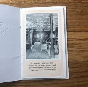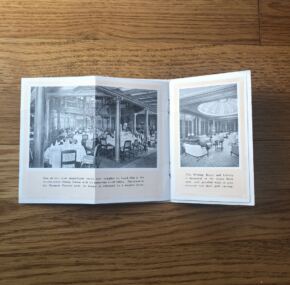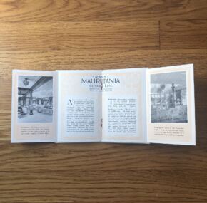 Here is one I haven’t had in some time. A cute brochure for the RMS Mauretania. Using fold outs it covers the majority of the first-class sections of the ship. Circa 1922-1925ish she is still listed as the fastest steamship in the world. 100 years old and hearkening back to an ever receding era. An embossed Cunard Line lion on the covers. In very good condition with rusty staples still holding and a spot or two on the cover.