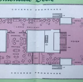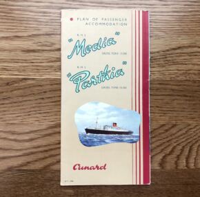 Impressive glossy full-color deck plan for Cunard’s little-loved Media and Parthia. They were two post-war beauties but were not really suited to the traffic needs of the day. Although if you had the time the service, luxury, and food were near the level of the Queens at FAR lower prices. The plan sports 9 full color images and is in excellent condition.