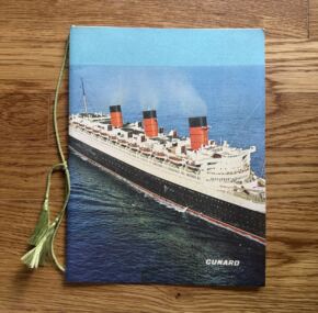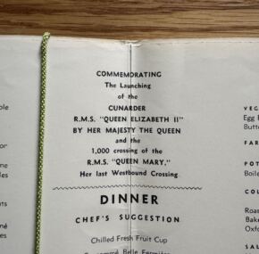 Who knew they did this? On the RMS Queen Mary’s last westbound crossing, listed here as her 1000th, Cunard commemorated the occasion of the launch of their new liner Queen Elizabeth 2 by Her Majesty the Queen. It was almost like handing over the reins from one Queen to another. Some tape on cover and half inch tear where the cord has bitten into the spine.