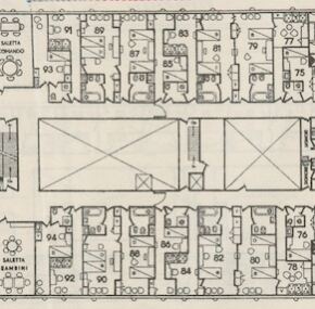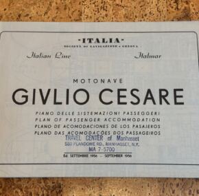 Excellent fold-open deck plan for Italy’s first post-war liner. Dated September, 1956, this tissue deck plan opens to about 37″ x 29″ and covers the entire ship. One photo of the ship at sea. She was a beauty! Mint.