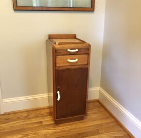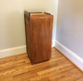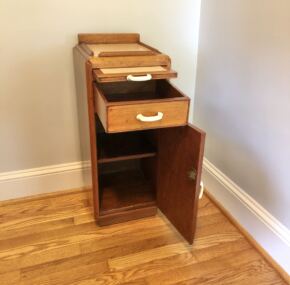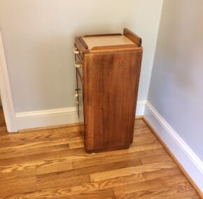 But back to our night stand…. It is in very good condition and sports its original finish as well as the pre- and post-war formica on the top and pullout. Measures 28″ tall x 12″ deep x 11″ wide which makes it a great size to fit almost any space.