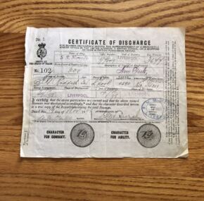 How cool to have a certificate of discharge from the White Star Liner ss Nomadic? Well, it’s not the tender Nomadic you are thinking of but still a cool piece! This is from the 1890s White Star Line cattle carrier ss Nomadic. As carting cattle eastbound in steerage quarters was becoming passé by 1890, White Star built a set of ships to haul cows only. This was removed from a gum book as these might date to a time before a crewman toted around his own small discharge booklet. Voyage from October, 1898. Highly unusual to find any discharge certificates at all, especially for 19th Century White Star ships.