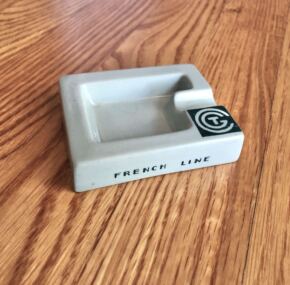 One of the most interesting souvenir hunts in history was created by the famous French Line.  CGT took an opportunity to manufacture their ashtrays designed by Jean Luce in fine porcelain for their flagship ss Normandie (Post-war ashtrays of the same shape were made of glass).  The ship was outfitted with individual ashtrays like this which say proudly French Line ss Normandie!  They were meant to be taken as advertising but perhaps not meant to be taken in such numbers that they were tough to keep in stock.  Quickly, the French Line took the few back that were left and put a black band over the ss Normandie part.  Slightly later, new ashtrays were made for Normandie that just said French Line, no mention of the world’s most-famous ship.  Here is the last of the 3 pre-war china ashtrays made for the Normandie!  Collect the whole set?