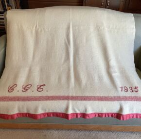 A lovely wool cabin blanket from the French liner Normandie. Has “CGT” and “1935” embroidered on both ends with lovely satin trim on either end. Measures about 70″ x 53″. In great condition with no holes that I see and only a few very small stains. Amazing not only to find one, but more so to find one in such great condition! Coming up on 100 years old. Grab it while you can because you may never see another in this condition!