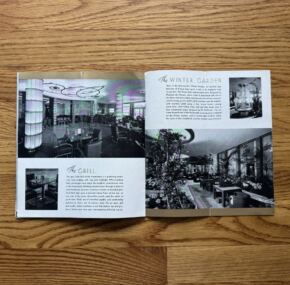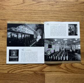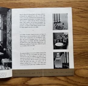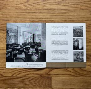 Facts About The Normandie.  This brochure has a rather unique point to make — to satisfy the public’s desire for stats and information about the world’s most luxurious liner.  So it is packed with all sorts of fantastic imagery.  Wouldn’t you like to have any of the things in these photos?  I love the silver candle holders.  The first-class sections covered include details about the rooms, their use, and the art within.  Unique smaller photos abound and make this brochure quite fascinating.