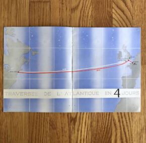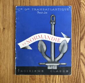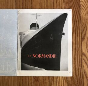 A tourist-class brochure for the Normandie in French. Fantastic cover art, but what makes it interesting are the renderings inside which make third-class look far more inviting but also suggest it is a maiden-voyage-era brochure. 16 pages with some color renderings. Makes a fine addition to any ocean-liner collection dropping anchor in a harbor called your collection.
