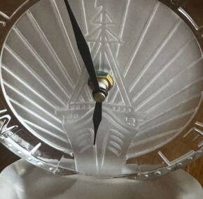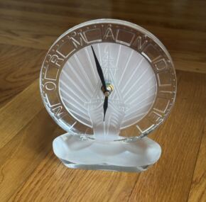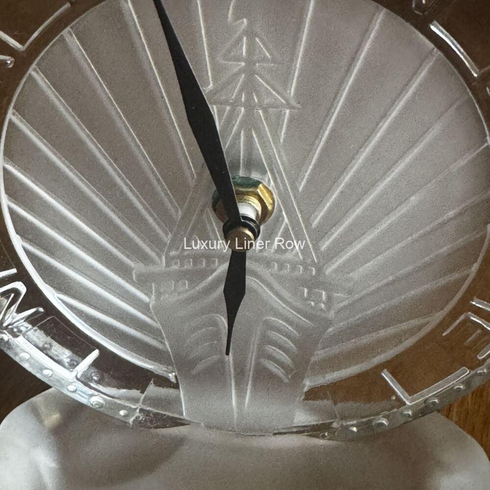 The famed crystal clock produced for the ss Normandie. This was reproduced about 30 years ago, and this is one of those amazing reproductions. In fantastic condition with its original box. Box has a touch of discoloration on one side. Works perfectly. This clock is a beautiful addition to your collection at the mere fraction of what an original goes for! JF