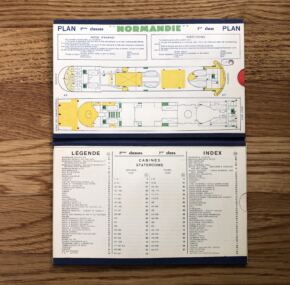 The French Line really went all out on intriguing deck plans for the Normandie. This is a cool plan where a small card pulls out showing various spots on the ship. You have a key code on the back which gives much detail about the locations shown. In excellent condition. Measures about 14¾” x 7½”.