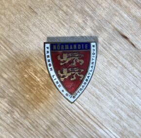 Lovely souvenir enameled broach as sold aboard the Normandie in her gift shops, showing the shield of the province of Normandie. As opposed to a pin, this one can be put through the lapel hole on a suit jacket. Happily, no loss to the enamel. Measures about 1″. Wear it to your next ship event!