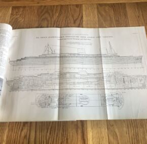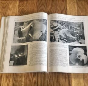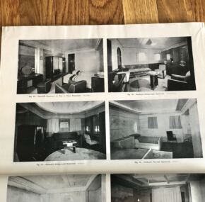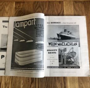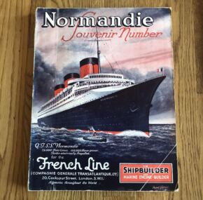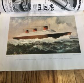 For one of the most beautiful and important ships ever built, relatively little has been written about the French Line’s Normandie.  This is what makes her special edition of The Shipbuilder even more special.  Even the reprints of 45 years ago are highly sought after.  Happily, this is the real deal.  It is an original 1935 edition that runs 154 pages of hard-core technical information with hundreds of photographs of every aspect of her design, and there are also over 50 pages of the all-important advertisements from her suppliers, for a total of over 200 pages of pure Normandie.  Of course, it has several color plates, pull out plans, and the all-exhaustive coverage for the ship’s details.  It’s your Normandie bible.  In very good condition.