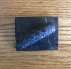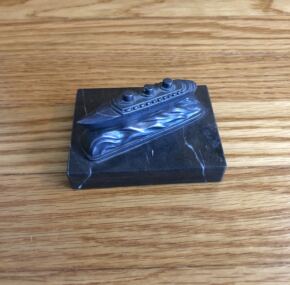 I have over the years had a number of these special ss Normandie desk-top souvenirs. You can’t really call them common, in fact, they are quite rare in this condition. Rare as hen’s teeth. This comes to us from the late dealer Ken Schultz and was featured in his catalog in the 1990s. If you remember Ken, then you will believe me when I say my prices are much lower today than his were in the 1980s! Don’t we all wish souvenirs (or for that matter most things in our modern life) were made with the quality of this small Normandie paperweight? Despite the flood of single-use plastics we are presented with daily, we can still own fine items crafted over 80 years ago. And what finery indeed CGT made sure of it. This model is on a beautiful slab of rich marble and expertly crafted out of what I believe to be bronze. In excellent condition and very heavy! Measures about 3.5″ x 3″.