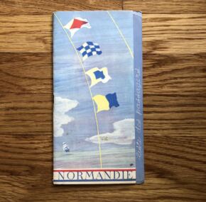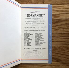 Second-class passenger list for the Normandie’s voyage from Le Havre to New York via Southampton. Sailing date was July 7, 1937. 1,112 passengers on board. Back shows where it had been attached to an album.