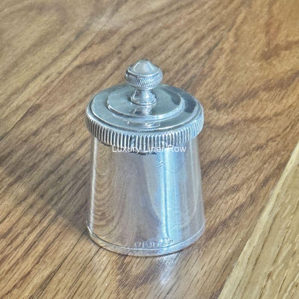 The French Line, ever attentive to your culinary needs, provided these small silver plated pepper grinders for table use. This one has the classic ss Normandie “dip” in the “C” in CGT. In very good condition and still comes apart to fill with pepper. Measures about 2.5″ tall. You could use this to spice up your next meal. The ship’s famous head chef Gaston Magrin would be proud.