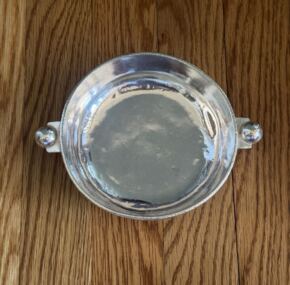 Another one of those pieces I am extremely proud to offer.  Only the third I have ever had.  A silver caviar serving dish by Christofle. The silver service on Normandie was pretty spectacular, and this piece shows why!  Very nice condition and a great addition for one of you.  One of the handles is slightly bent down.  This will be an asset to any collection.  Measures 6.5″ from handle to handle and 2″ tall.  JF