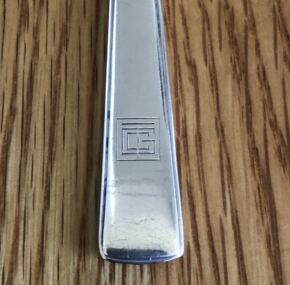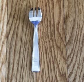 Unusually shaped silver fork from the famed ss Normandie. From her second-class service, this fork was made by Ercuis and is complete with hallmark. Measures about 5″ long.