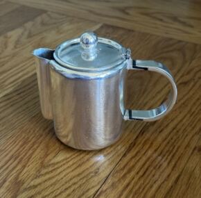 Rarely seen hot-water jug form the service of the ss Normandie.  You can tell this is for hot water because of the spacers between the pot and the handle.  These spacers keep the handle cool to the touch.  Made by Christofle and measures about 5.5″ handle to spout.  The most Art Deco tea service of any ship or line.  JF