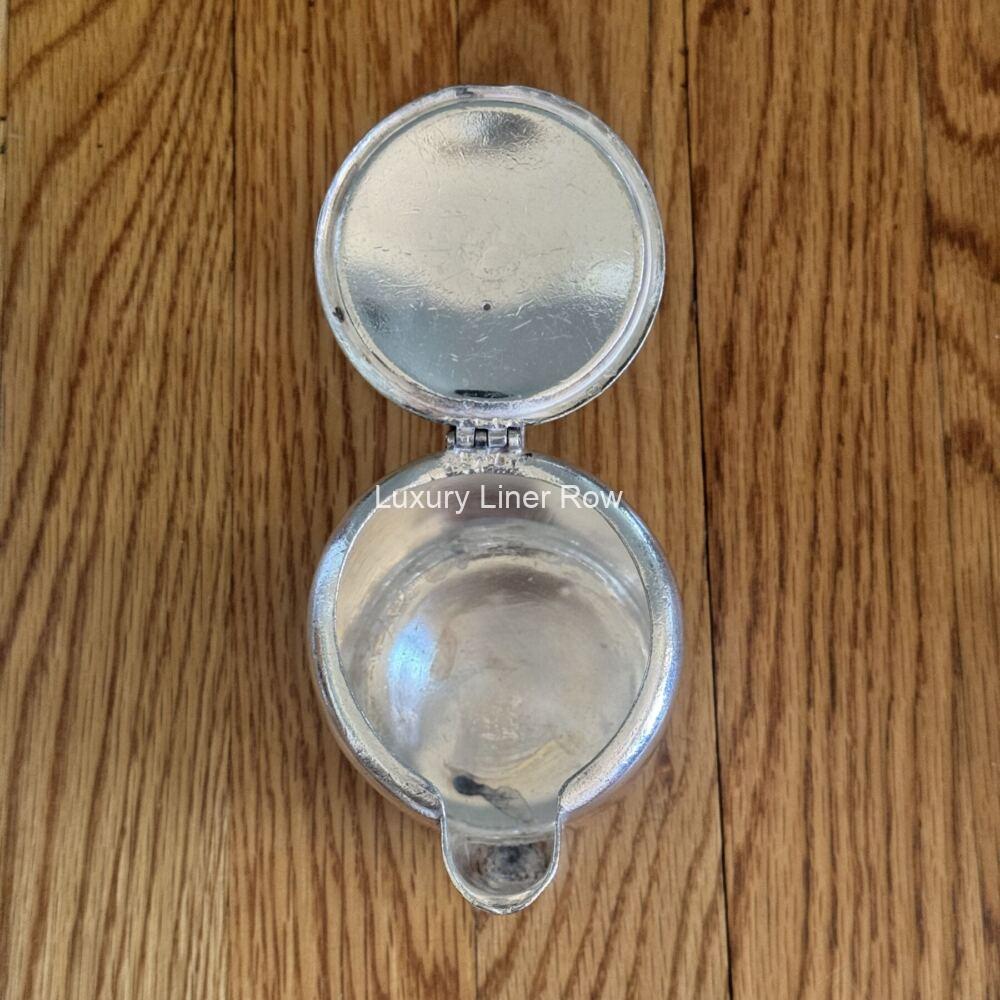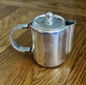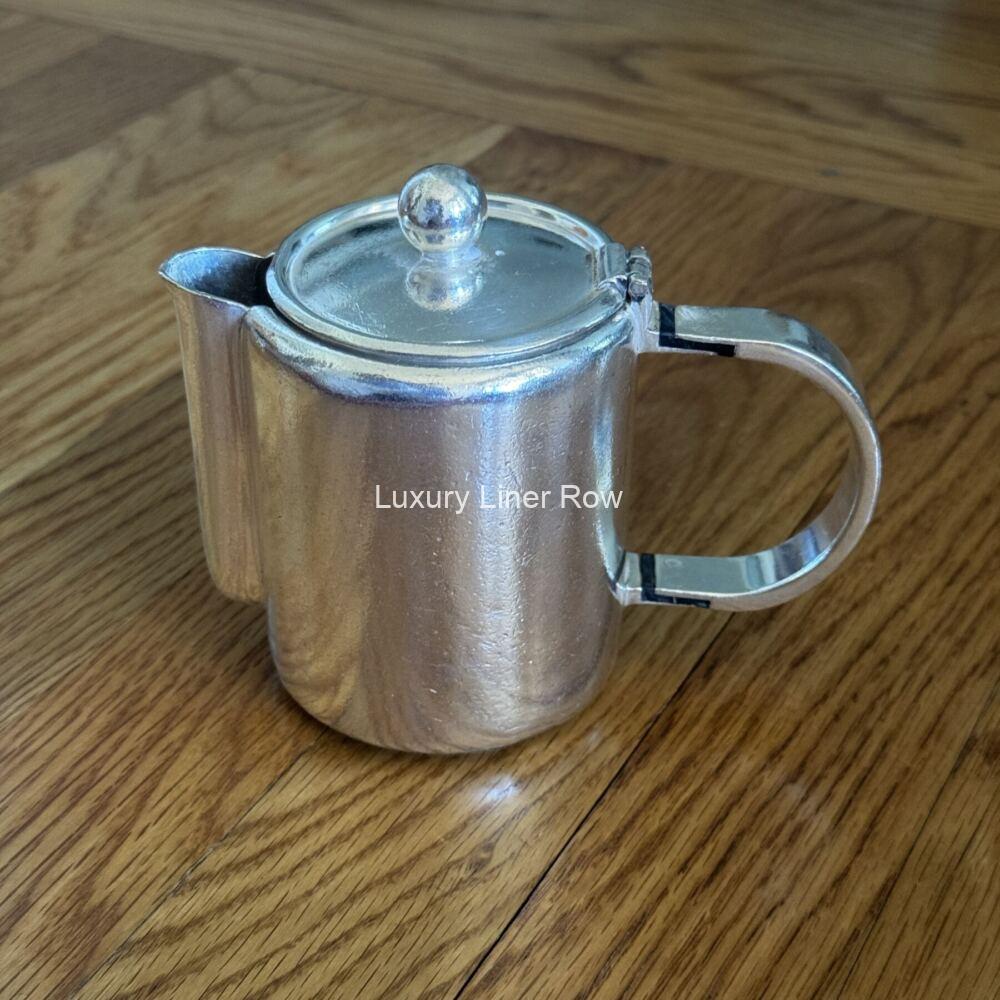 Rarely seen hot-water jug form the service of the ss Normandie.  You can tell this is for hot water because of the spacers between the pot and the handle.  These spacers keep the handle cool to the touch.  Made by Christofle and measures about 5.5″ handle to spout.  The most Art Deco tea service of any ship or line.  JF