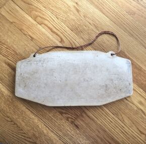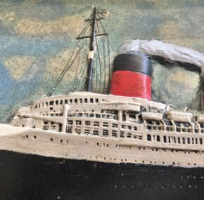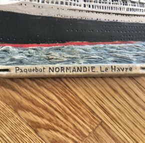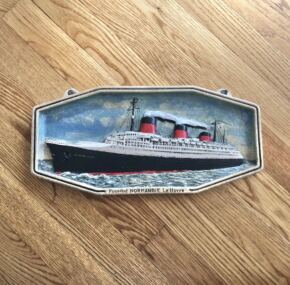 Souvenir plaque from the ss Normandie. These types of plaques sometimes turn up for the RMS Queen Mary, but this is the first time I have had one for the Normandie. Made of a type of porcelain bisque, it is in excellent condition and has had its paint expertly touched up. Vibrant and bright, it will be an asset to any French Line Normandie collection. 14.5″ x 6.75″ with no chips or cracks.
