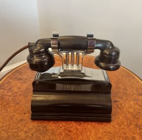 Wow! This is the first time I have ever had one of these beauties! This phone is so Art Deco and is coveted throughout the ocean-liner collecting world as a king-making piece for any collection. Telephone collectors also go nuts for these, and as a result, they are very had to source. Note the archival photo of an identical phone in her ship-to-shore telephone room. In excellent condition, but the cord that attaches to the wall is missing but easily replaced. I have a customer who has hooked his to his landline, and it’s a hoot to hear it ring. Only the finest from Luxury Liner Row. AC