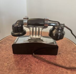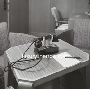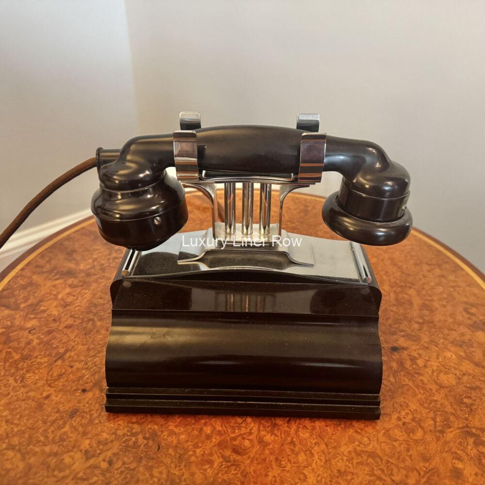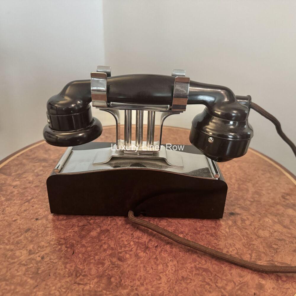Wow! This is the first time I have ever had one of these beauties! This phone is so Art Deco and is coveted throughout the ocean-liner collecting world as a king-making piece for any collection. Telephone collectors also go nuts for these, and as a result, they are very had to source. Note the archival photo of an identical phone in her ship-to-shore telephone room. In excellent condition, but the cord that attaches to the wall is missing but easily replaced. I have a customer who has hooked his to his landline, and it’s a hoot to hear it ring. Only the finest from Luxury Liner Row. AC