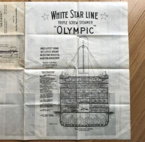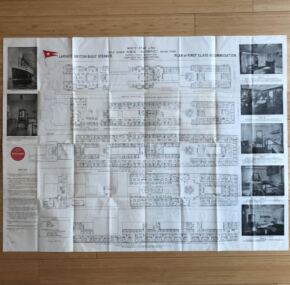 The best first-class deck plan I have ever carried for the “Old Reliable.” Interestingly, it is dated July, 1913, and reprinted after the war in 1920, listing the à la carte restaurant simply as the “B Deck dining saloon.” I love just sitting down with an RMS Olympic deck plan and looking at it. The things you learn! This was a unique period in Olympic’s history and for that matter White Star Line where transatlantic services had not quite returned to normal following the war. A fantastic cutaway of the ship is shown on the reverse. Measures about 40″ x 30 and just begs to be framed! In excellent condition with no pin holes at the folds, and the only sign of ageing is the darkening of a few panels panels when folded. One tiny tape repair at the top edge.
