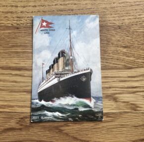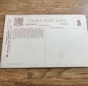 The famous Tuck’s postcard of RMS Olympic at sea. Unused and in great condition. This is an asset to any White Star Line collection. Not a reproduction, and I can–I feel certain–invoke my sterling reputation here in this regard. I don’t sell reproductions, and I never will.