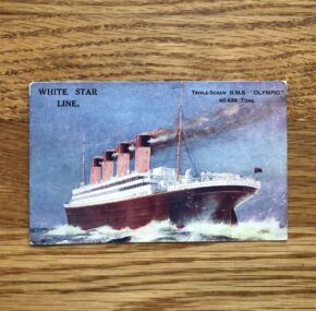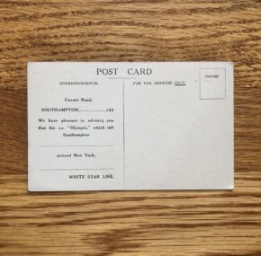 This is my personal favorite postcard of RMS Olympic. Isn’t she powerful and sleek looking in this image from her gravy years of the 1920s? This is Olympic back on top after the war. Don’t we all want to go back and do one round-trip crossing on her! I know I do. Unused and in very good condition.