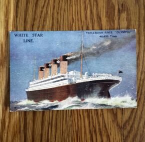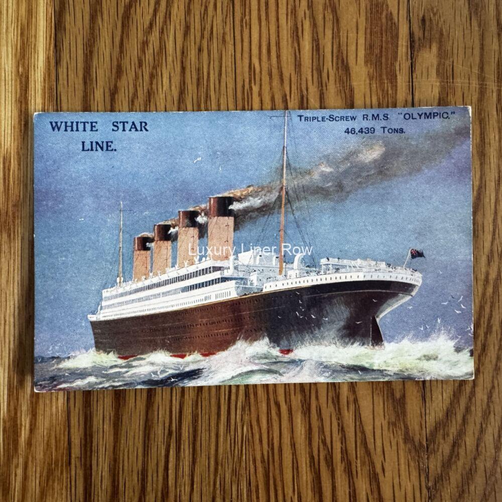This is my personal favorite postcard of RMS Olympic. Isn’t she powerful and sleek looking in this image from her gravy years of the 1920s? This is Olympic back on top after the war. Don’t we all want to go back and do one round-trip crossing on her! I know I do. Unused and in very good condition.