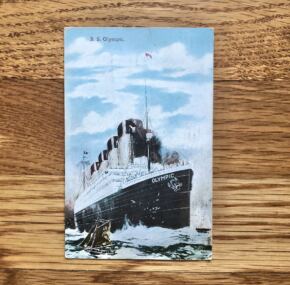 Not wanting to miss out on the PR gold mine of the largest and most famous vessels in the world, New York postcard producers quickly got into the game themselves. This maiden-voyage-era card is postmarked in NY on Sept 2, 1913. In good condition with bumps to corners.
