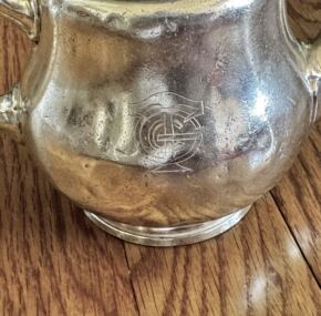 Lovely silver tea pot form the service of the ss Paris.  She is an interesting ship because she was laid down before World War I, launched in 1916, but not completed until 1921.  This is from the second-class service and made by Ercuis.  Appears to be a two-cup pot.  I’ve never had another (and probably won’t get another)!  So if the Paris is your ship, grab it!  About 6.5″ handle to spout.  Some denting and some wear and tear from use, but given the fact it’s over 100 years old, not surprising.  JF