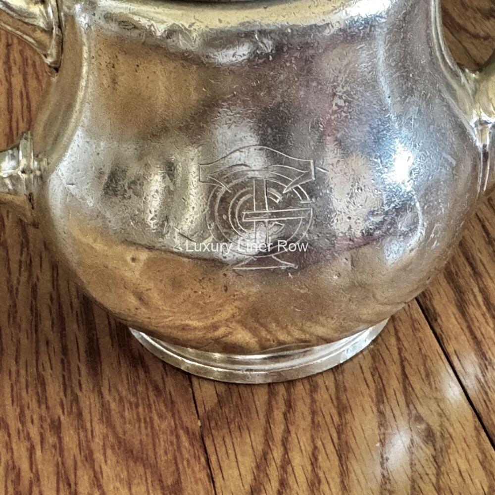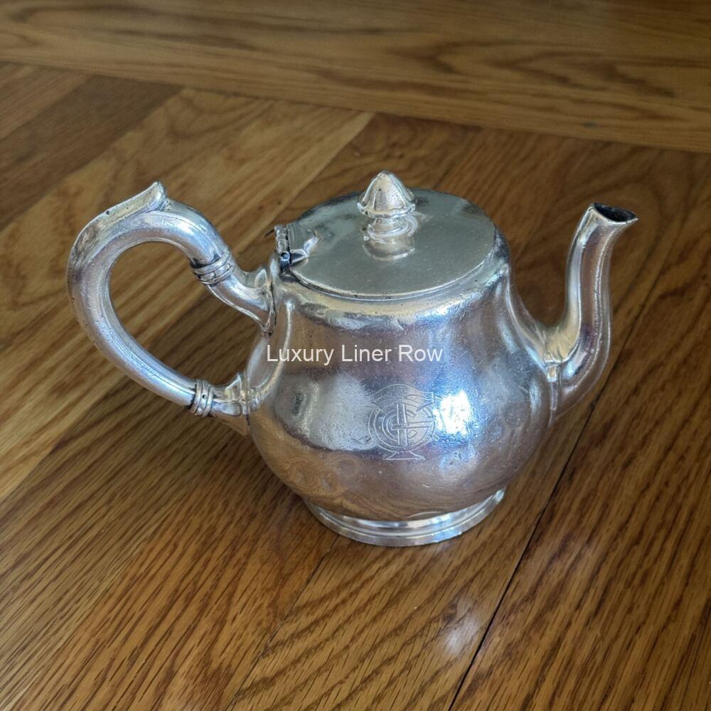 Lovely silver tea pot form the service of the ss Paris.  She is an interesting ship because she was laid down before World War I, launched in 1916, but not completed until 1921.  This is from the second-class service and made by Ercuis.  Appears to be a two-cup pot.  I’ve never had another (and probably won’t get another)!  So if the Paris is your ship, grab it!  About 6.5″ handle to spout.  Some denting and some wear and tear from use, but given the fact it’s over 100 years old, not surprising.  JF