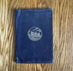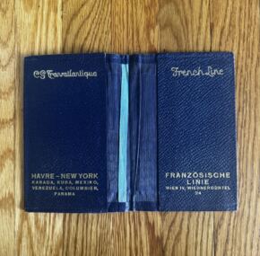 Leather ticket wallet with a vignette of the kind-of-forgotten ss Paris of 1916. Launched in the dark days of World War I, the Paris would not start her maiden voyage until 1921! She was the first large French liner to incorporate the new Art Nouveau style in her interiors. She was lovely! Inside text is in German. A bit of wear on the spine. Measures about 7″ x 4.75″. JF