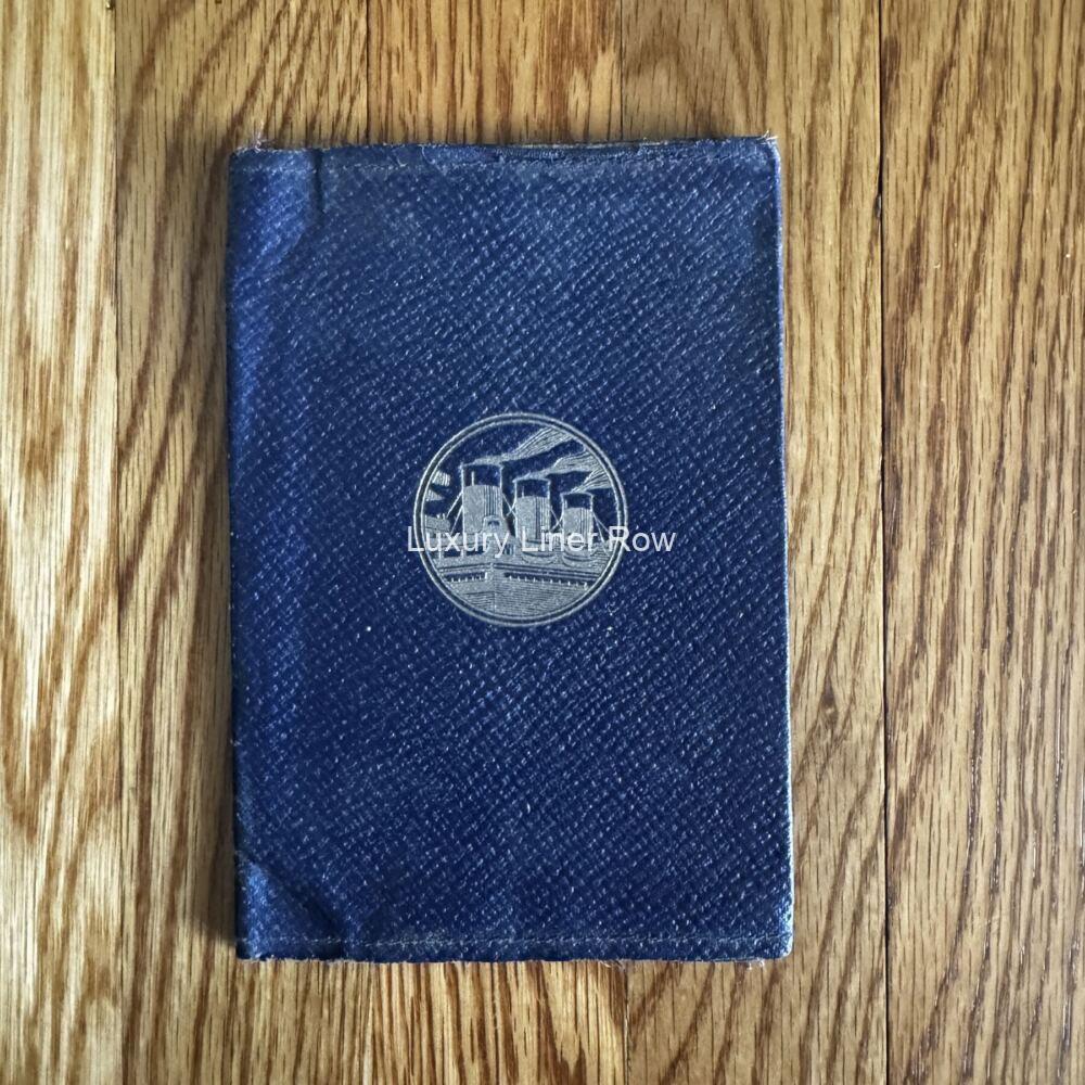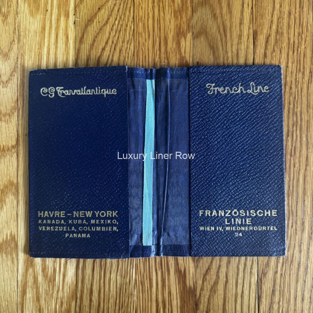 Leather ticket wallet with a vignette of the kind-of-forgotten ss Paris of 1916. Launched in the dark days of World War I, the Paris would not start her maiden voyage until 1921! She was the first large French liner to incorporate the new Art Nouveau style in her interiors. She was lovely! Inside text is in German. A bit of wear on the spine. Measures about 7″ x 4.75″. JF