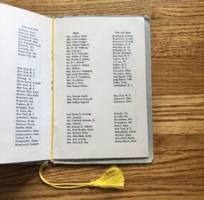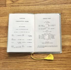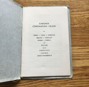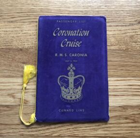 How do I sum up the event that I consider to be without doubt the biggest in Cunard’s post-war period? RMS Caronia’s coronation cruise of 1953 is really a high water mark in ocean going cruising. Perhaps only being equaled or topped by ss Normandie’s little Rio jaunts in the late 1930s. I’d love to go on a coronation cruise in 2024 that is even partially the equal of Caronia’s. So I will just let this superb Coronation Cruise passenger list speak for itself. This is Cunard’s finest passenger list cover and is in exquisite royal purple flocked velvet. Only a few of these must survive. This is just the fourth that I have had since I began collecting for RMS Caronia nearly 20 years ago. An interesting tidbit is that a passenger on this trip was Mrs. JD Wrather (Bonita Granville Wrather), whose husband’s company later went on in the early 1980’s to manage the Queen Mary in Long Beach. This list is in very good condition and is tied with a silk cord.