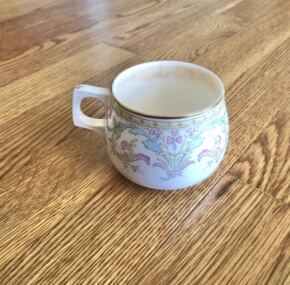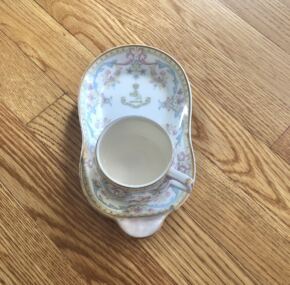 Cup has no chips, cracks, or crazing but the inside is a bit stained. The cup is marked “souvenir.” The tray has a few small hairlines and overall crazing with some discoloration in a few spots around the edges. This is not marked “souvenir” and is an in-service piece.